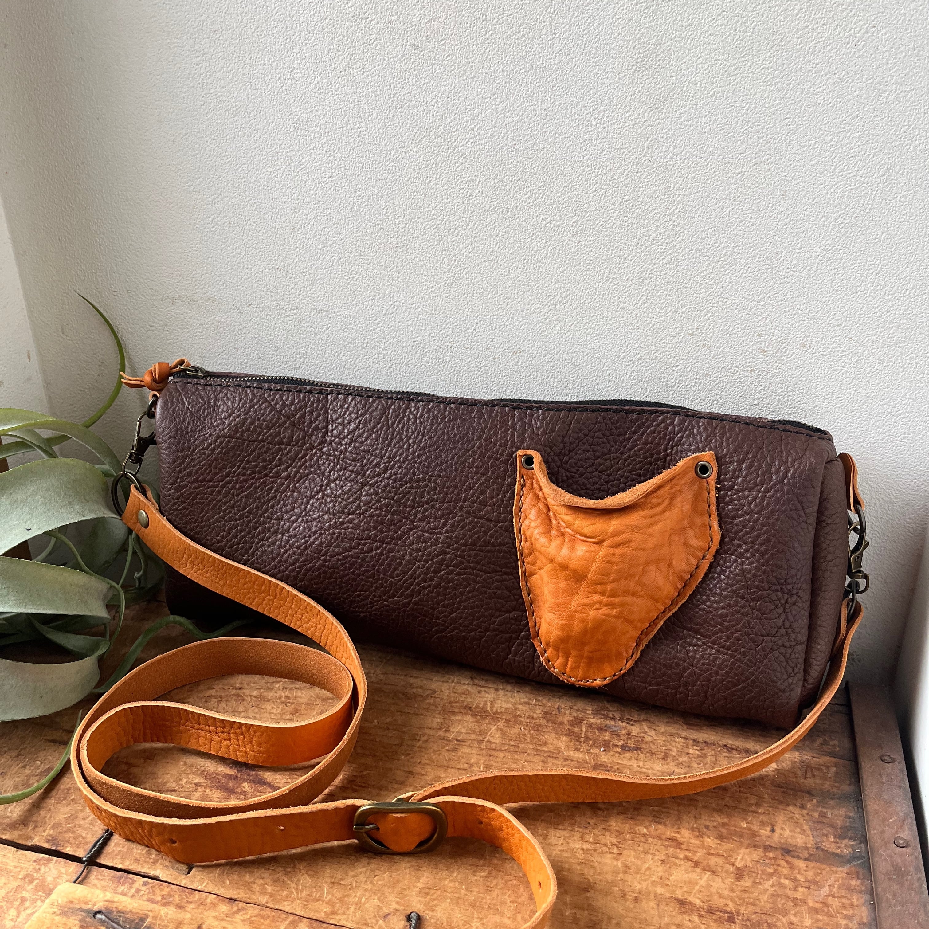 焦茶色のマットな質感の革にキャメルのくったりポケットがアクセントの横長サコッシュバッグです。