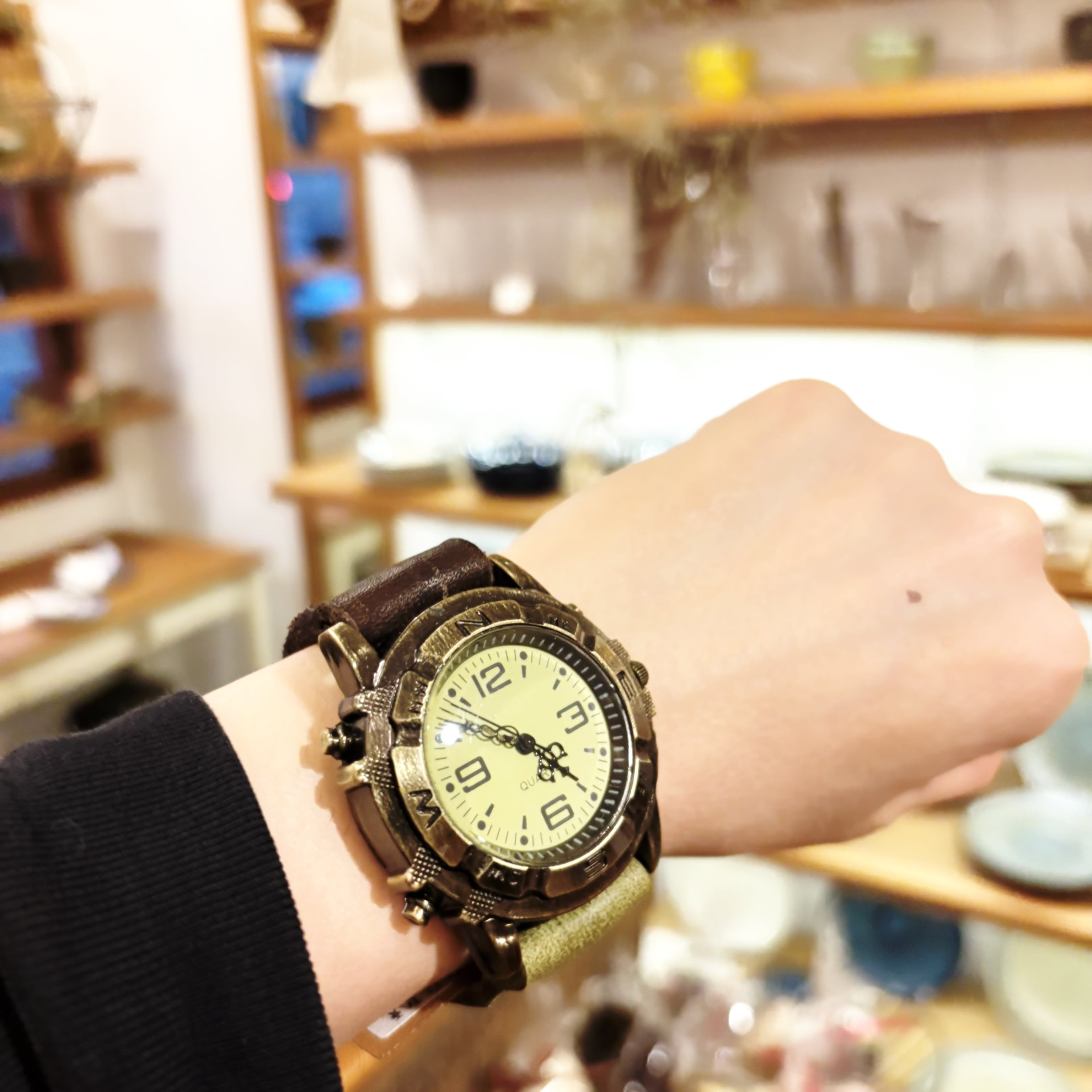 ミリタリー調のカッコイイ大きめ文字盤の腕時計です。