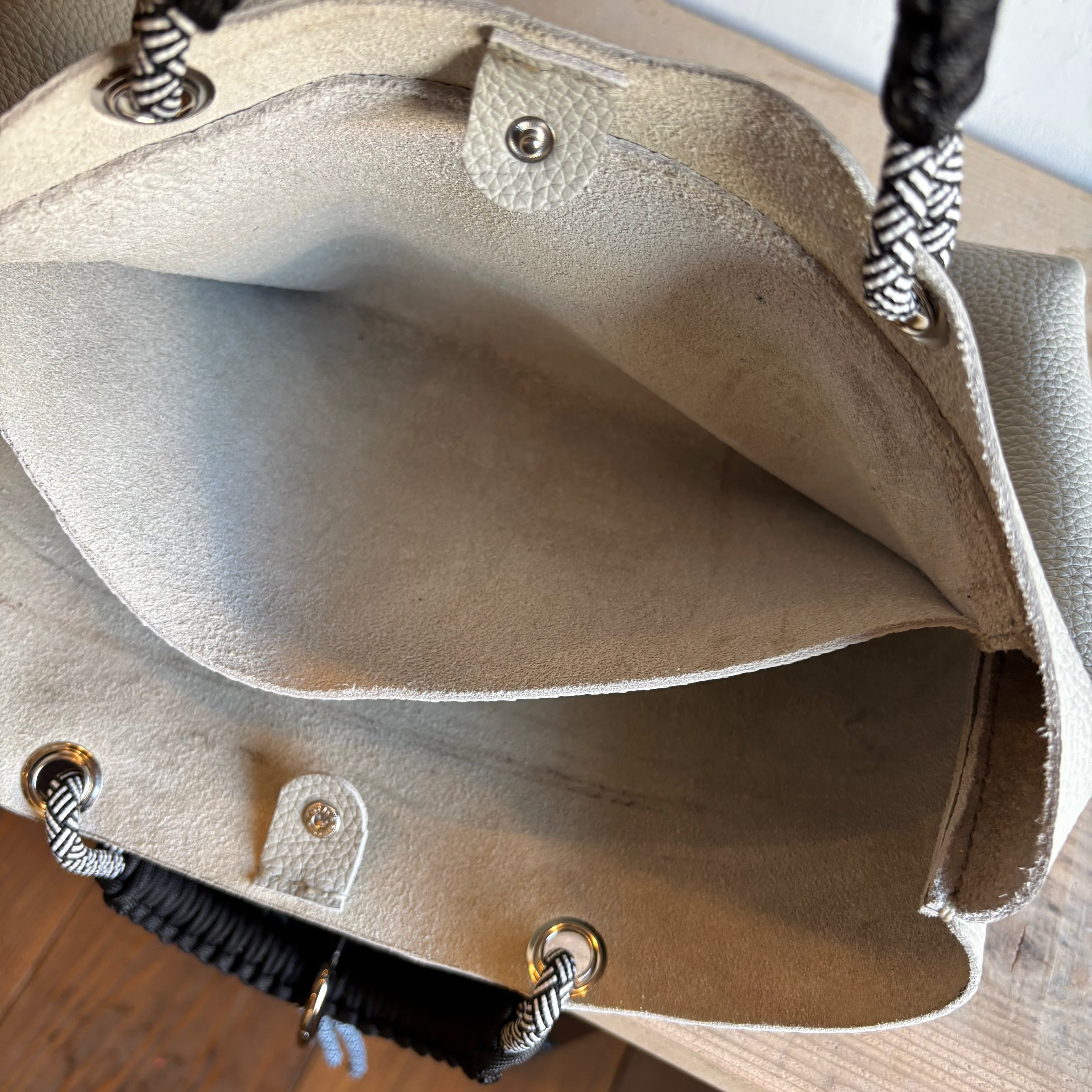 柔らかいグレーベージュの革と、